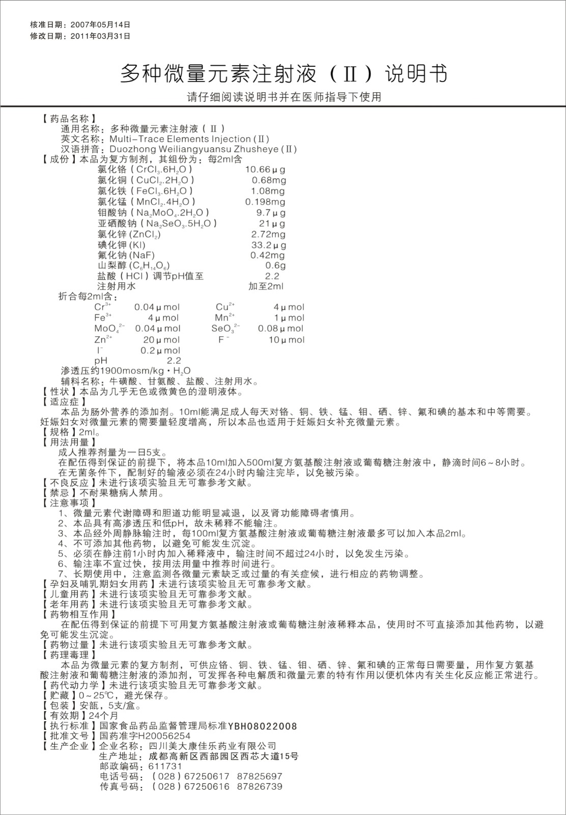 本品為腸外營養的添加劑。10ml能滿足成人每天對鉻、銅、鐵、錳、鉬、硒、鋅、氟和碘的基本和中等需要。妊娠婦女對微量元素的需要量輕度增高,所以本品也適于妊娠婦女補充微量元素。